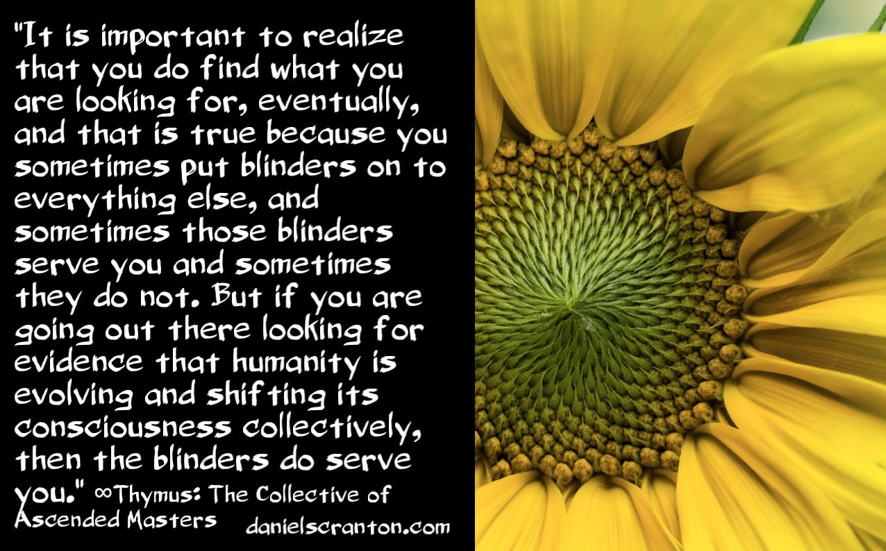 You are awakening more and more every day, both individually and collectively, and if you are open to seeing the rising consciousness out there in humanity, you definitely will find it. It is important to realize that you do find what you are looking for, eventually, and that is true because you sometimes put blinders on to everything else, and sometimes those blinders serve you and sometimes they do not. But if you are going out there looking for evidence that humanity is evolving and shifting its consciousness collectively, then the blinders do serve you. If you want to go looking for problems out there in the world, or within yourself, you can find them. And you can continually find things to fix, either out there or inside of you.