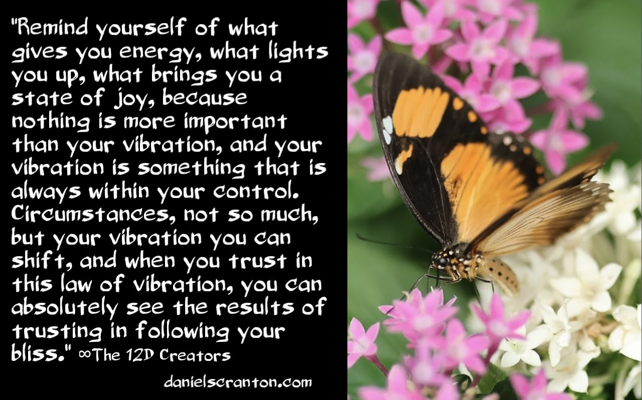 Remind yourself of what gives you energy, what lights you up, what brings you a state of joy, because nothing is more important than your vibration, and your vibration is something that is always within your control. Circumstances, not so much, but your vibration you can shift, and when you trust in this law of vibration, you can absolutely see the results of trusting in following your bliss. Being in the flow means things happen easily for you, things fall into your lap, helpers show up, and you don’t have as many things on your Things-To-Do-Today list. You will have more faith and more trust when you put what we are saying to the test, and every single one of you can, no matter what you might think to be the case. Prove to yourselves that what we are saying works, and you will lead a happier life.