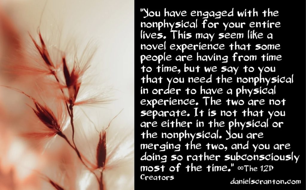 You have engaged with the nonphysical for your entire lives. This may seem like a novel experience that some people are having from time to time, but we say to you that you need the nonphysical in order to have a physical experience. The two are not separate. It is not that you are either in the physical or the nonphysical. You are merging the two, and you are doing so rather subconsciously most of the time. Sometimes you will do it consciously, and you will have a channeling experience. Sometimes you will recognize it as a channeling experience, and sometimes you will not.