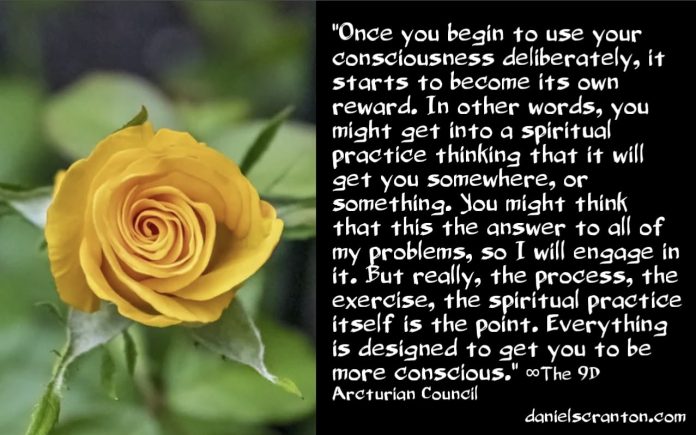 Once you begin to use your consciousness deliberately, it starts to become its own reward. In other words, you might get into a spiritual practice thinking that it will get you somewhere, or something. You might think that this the answer to all of my problems, so I will engage in it. But really, the process, the exercise, the spiritual practice itself is the point. Everything is designed to get you to be more conscious, to get you to be more deliberate about your focus, your intention, your words, your thoughts, and your actions. Truly, that’s the only way to live.