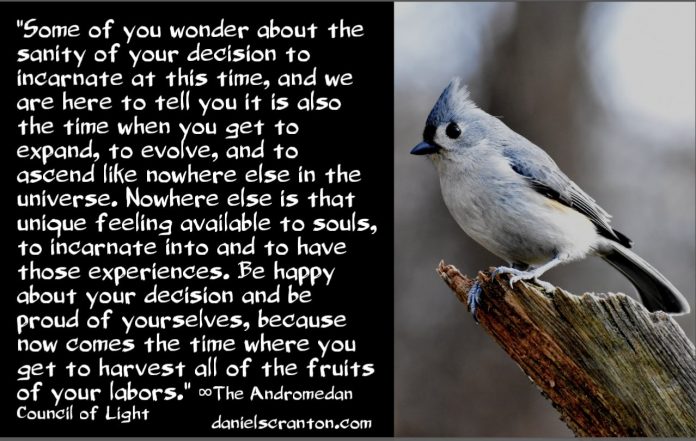 Now, some of you wonder about the sanity of your decision to incarnate at this time, and we are here to tell you it is also the time when you get to expand, to evolve, and to ascend like nowhere else in the universe. Nowhere else is that unique feeling available to souls, to incarnate into and to have those experiences. Be happy about your decision and be proud of yourselves, because now comes the time where you get to harvest all of the fruits of your labors. Now you get to experience the fun part, and it will start getting fun as soon as you believe that it is possible for your lives to be fun given where you are right now. Where you are right now is not as bad as you can make it out to be, but you have to put forth a little effort, focus, on the silver lining, and you have to put on those rose-colored glasses, because it’s up to you.