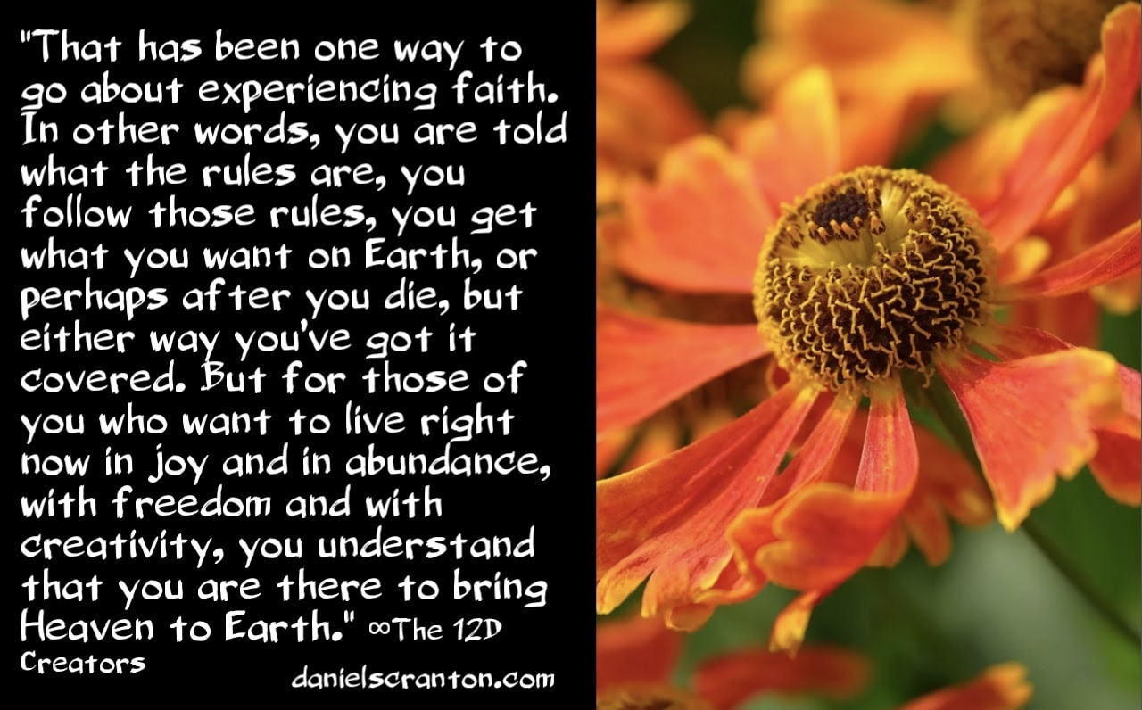 And that has been one way to go about experiencing faith. In other words, you are told what the rules are, you follow those rules, you get what you want on Earth, or perhaps after you die, but either way you’ve got it covered. But for those of you who want to live right now in joy and in abundance, with freedom and with creativity, you understand that you are there to bring Heaven to Earth. You are there to experience all that you want to experience while in the flesh and by believing in yourselves and in the laws of the universe.