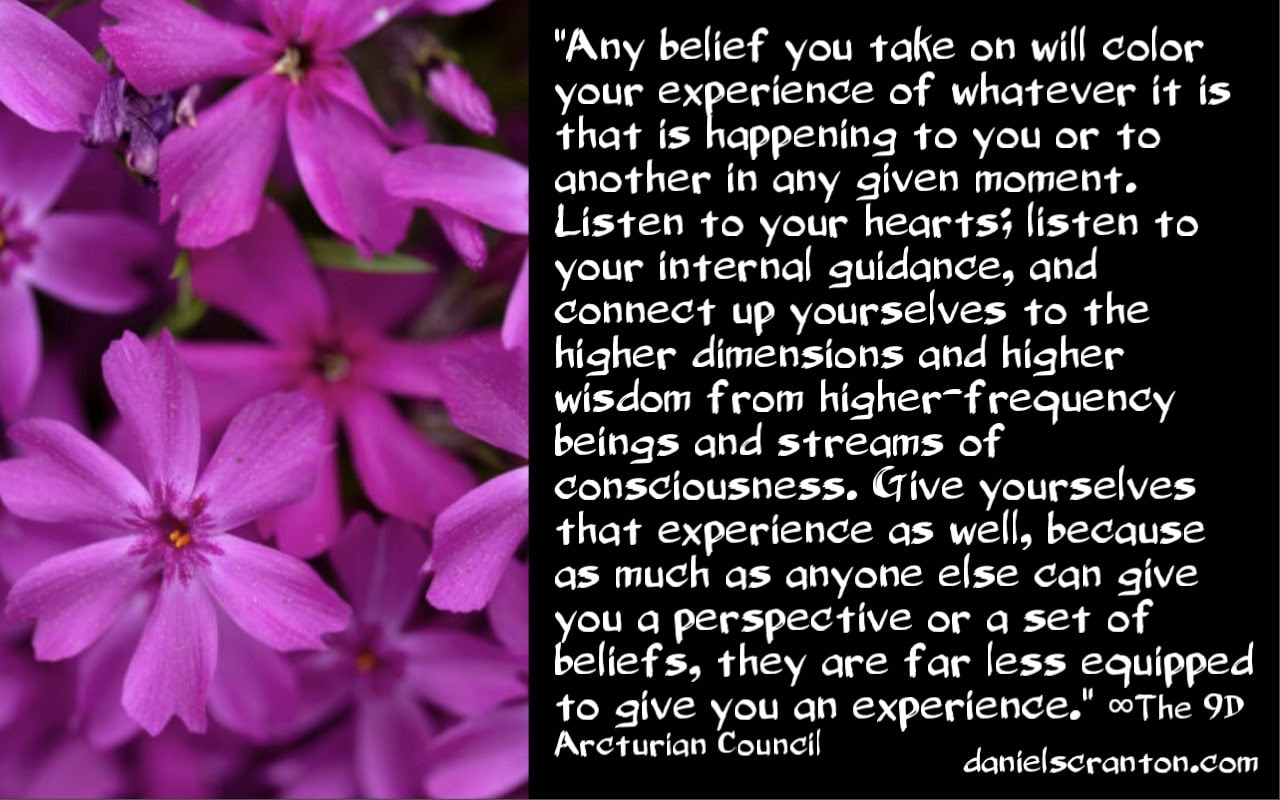 Create your experience of it, and know that any belief you take on will color your experience of whatever it is that is happening to you or to another in any given moment. Listen to your hearts; listen to your internal guidance, and connect up yourselves to the higher dimensions and higher wisdom from higher-frequency beings and streams of consciousness. Give yourselves that experience as well, because as much as anyone else can give you a perspective or a set of beliefs, they are far less equipped to give you an experience. That is something you must seek out for yourselves so that you can do more than just believe. You can know. You know more, and you learn more through experience than you do through theory and through scientific study.
