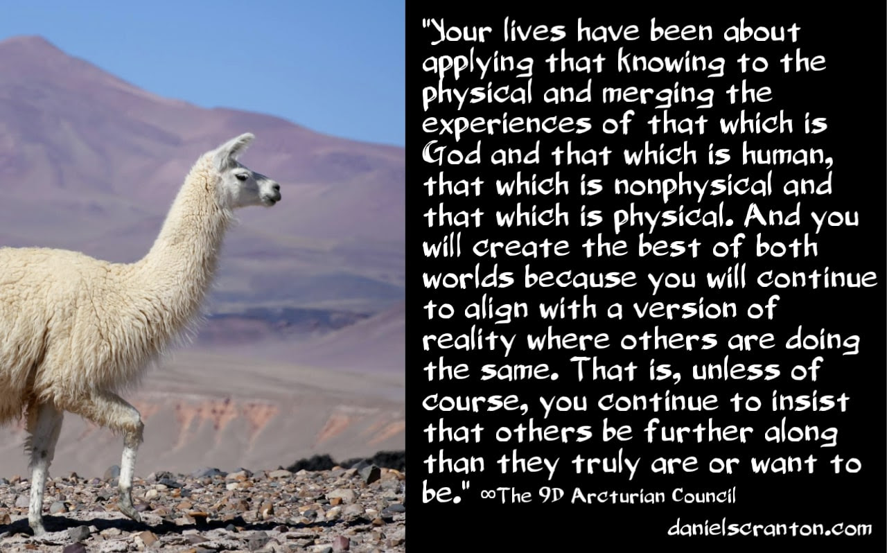 Your lives have been about applying that knowing to the physical and merging the experiences of that which is God and that which is human, that which is nonphysical and that which is physical. And you will create the best of both worlds because you will continue to align with a version of reality where others are doing the same. That is, unless of course, you continue to insist that others be further along than they truly are or want to be. Relax into the unity consciousness that is always present and is always inevitable for all of us to experience in this beautiful universe of ours.