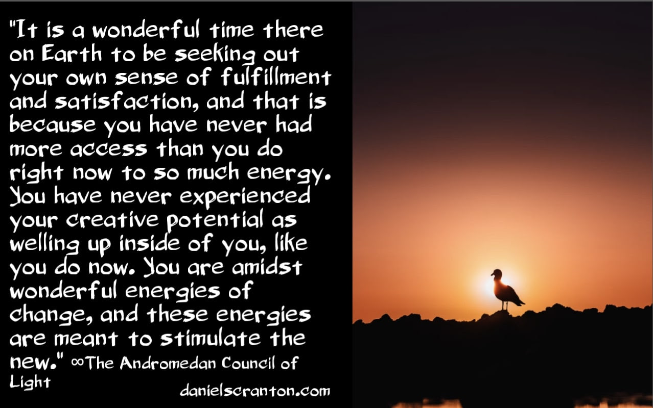 It is a wonderful time there on Earth to be seeking out your own sense of fulfillment and satisfaction, and that is because you have never had more access than you do right now to so much energy. You have never experienced your creative potential as welling up inside of you, like you do now. You are amidst wonderful energies of change, and these energies are meant to stimulate the new, to bring about that which is different. You all know that you like what is different, and you know how capable you are of bringing to fruition something that you would like to experience that goes beyond that which is traditional.