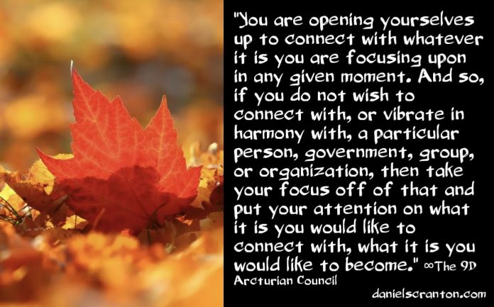 We are very pleased to be visiting with you once again, and we want you to know that we are visiting with you always. And so, what we mean is, visiting with you through this particular channel. We can reach any of you at any time, and it is your openness to us that makes that possible. You are opening yourselves up to connect with whatever it is you are focusing upon in any given moment. And so, if you do not wish to connect with, or vibrate in harmony with, a particular person, government, group, or organization, then take your focus off of that and put your attention on what it is you would like to connect with, what it is you would like to become.