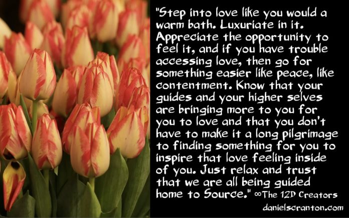 Step into love like you would a warm bath. Luxuriate in it. Appreciate the opportunity to feel it, and if you have trouble accessing love, then go for something easier like peace, like contentment. Know that your guides and your higher selves are bringing more to you for you to love and that you don’t have to make it a long pilgrimage to finding something for you to inspire that love feeling inside of you. Just relax and trust that we are all being guided home to Source, which is the Source of love and which is love.