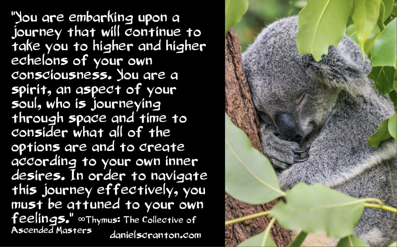 You are embarking upon a journey that will continue to take you to higher and higher echelons of your own consciousness. You are a spirit, an aspect of your soul, who is journeying through space and time to consider what all of the options are and to create according to your own inner desires. In order to navigate this journey effectively, you must be attuned to your own feelings. This is why it is always so important for you to allow your emotions to be what they are.