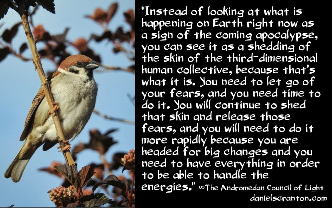 And so, instead of looking at what is happening on Earth right now as a sign of the coming apocalypse, you can see it as a shedding of the skin of the third-dimensional human collective, because that’s what it is. You need to let go of your fears, and you need time to do it. You will continue to shed that skin and release those fears, and you will need to do it more rapidly because you are headed for big changes and you need to have everything in order to be able to handle the energies of the shifts and changes that are to come for humanity.