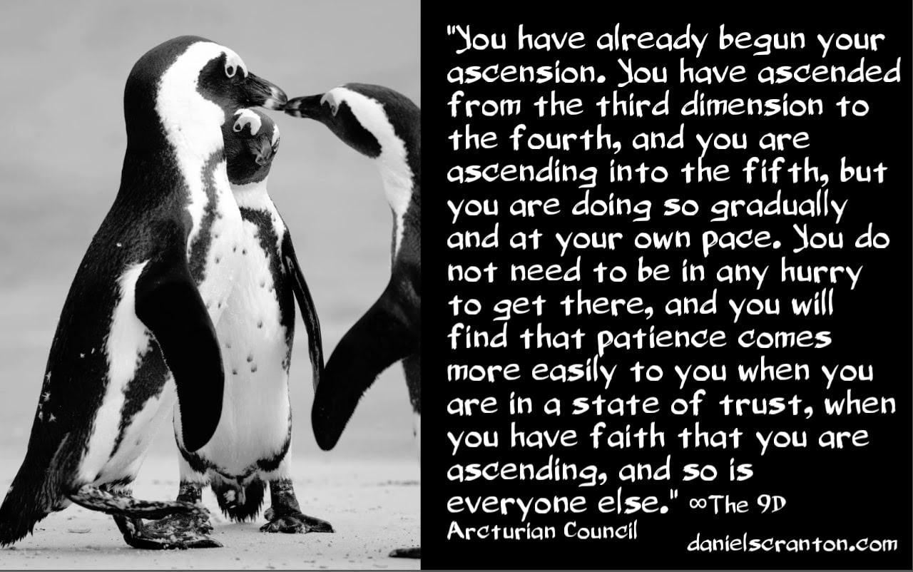 You have already begun your ascension. You have ascended from the third dimension to the fourth, and you are ascending into the fifth, but you are doing so gradually and at your own pace. You do not need to be in any hurry to get there, and you will find that patience comes more easily to you when you are in a state of trust, when you have faith that you are ascending, and so is everyone else.