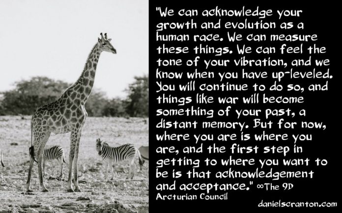 We have been witnessing humanity’s evolution for quite some time now, and we want to tell you that we understand that it is hard for you all to notice it from where you are sitting, but we also would like for you to accept that we can acknowledge your growth and evolution as a human race. We can measure these things. We can feel the tone of your vibration, and we know when you have up-leveled. You will continue to do so, and things like war will become something of your past, a distant memory. But for now, where you are is where you are, and the first step in getting to where you want to be is that acknowledgement and acceptance of where you are.