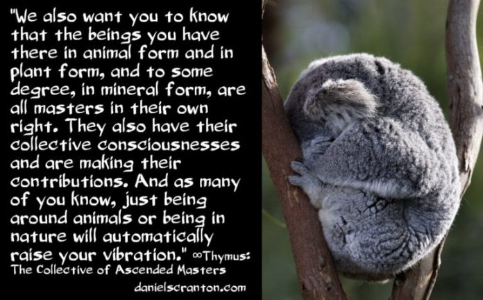 We also want you to know that the beings you have there in animal form and in plant form, and to some degree, in mineral form, are all masters in their own right. They also have their collective consciousnesses and are making their contributions. And as many of you know, just being around animals or being in nature will automatically raise your vibration. What that means is that you really do have a choice there on Earth in terms of what you put your attention on, what you tune into and what you vibrate in harmony with. There are many, many choices available to you all the time and more and more coming all the time so that you have all the freedom to choose that you could ever want.